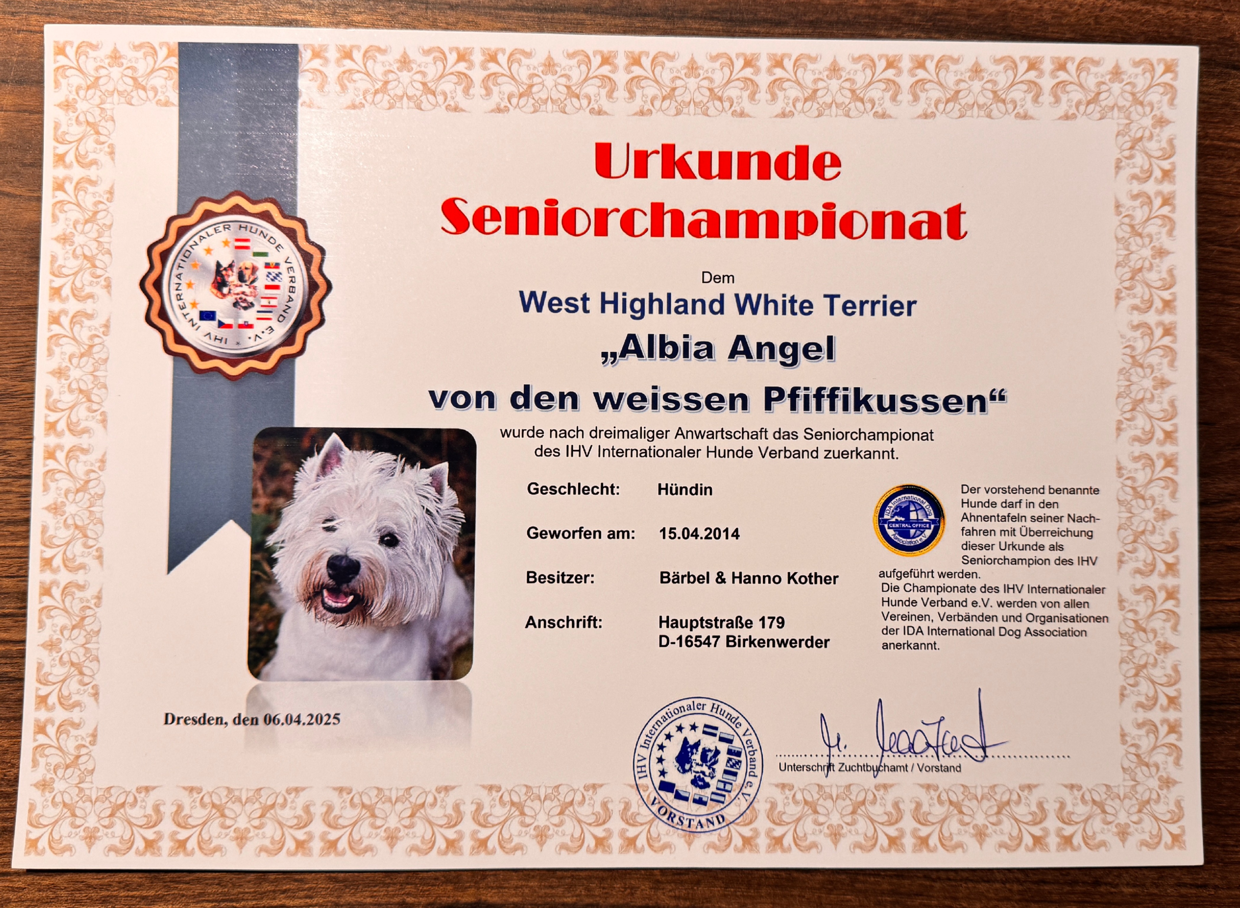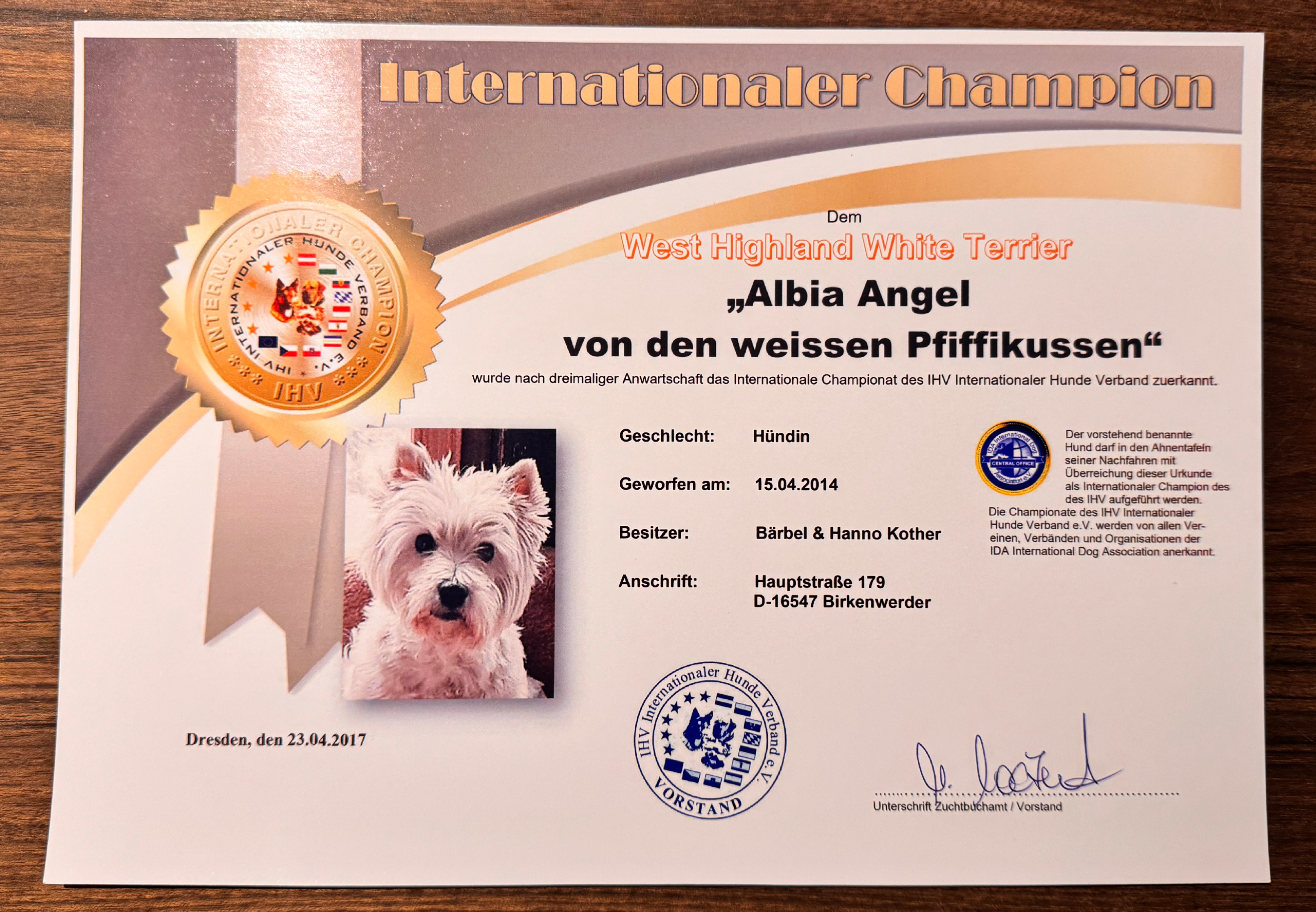 Am 19.4.2015 wurde unsere Albia auf der Internationalen Hundeausstellung CACIB Leipzig ausgestellt und erhielt den Siegerpreis V1 in der Jugendklasse Victoria Schau 2015 sowie den Siegerpreis V1 in der Jugendklasse ACW Eurocup 2015.